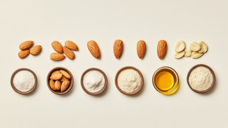 A visually appealing layout of various baking ingredients, featuring almonds, flour, and oil, perfect for culinary projects or healthy cooking inspiration.