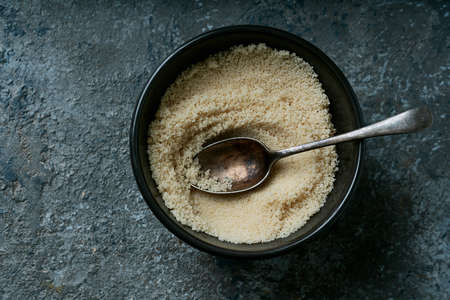 Organic brown sugar in a bowl in a spoon over a grey background. Top View. Flat Lay. Copy Space