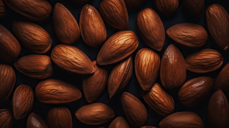 Almonds scattered on a black table. Almond is a healthy vegetarian protein nutritious food. Natural nuts snacks.