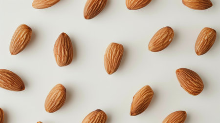 A close-up of raw almonds scattered on a white background, showcasing their natural texture and shape in a clean, minimalist setting.