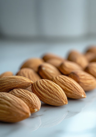 Almonds are neatly arranged in a row on a smooth, minimalist surface. The focus on the almonds highlights their texture, perfect for culinary presentations or health-conscious displays.