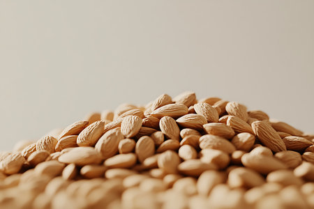 Detailed image presents a pile of raw almonds under soft lighting, highlighting their natural textures and warm color tones. The minimalist backdrop emphasizes the nuts' organic appeal.