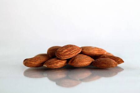 Almonds with reflection on white background.
