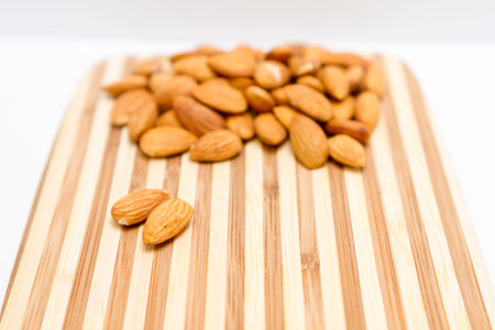 a handful of almonds on a wooden board