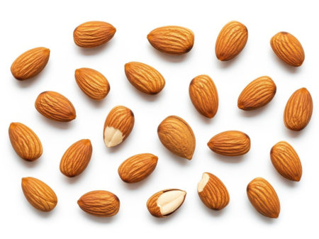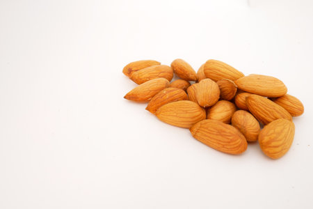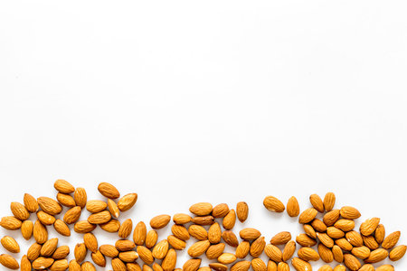 Almond nuts flat lay on white background with copy space, perfect for healthy eating themes, nutrition concepts, natural food photography, and organic ingredient projects.