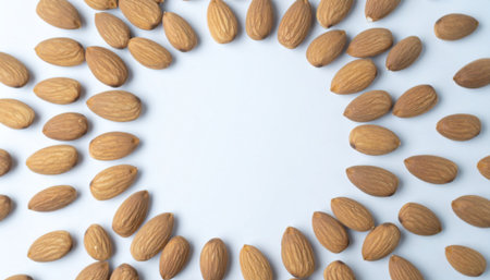 Almonds forming a decorative border on a light background, showcasing their natural texture and color, perfect for promoting healthy eating