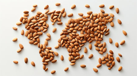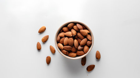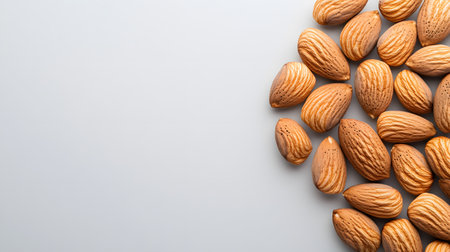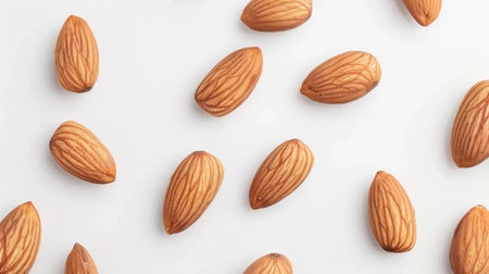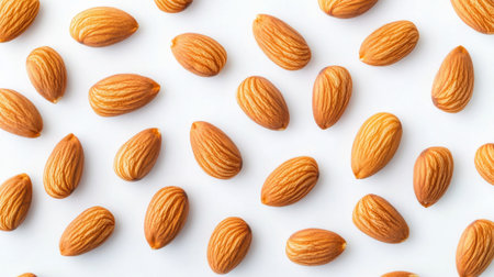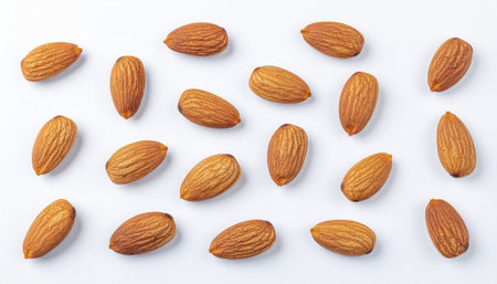 A top-down view of almonds arranged neatly on a clean white background for a minimalist look.