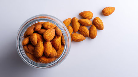 Almonds in a clear glass jar tipped over on white background, top view with clean space
