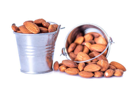 almonds in a bucket on a white background. The concept of healthy food.