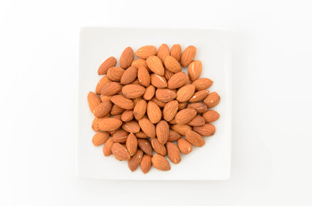 unglazed almonds on a white square plate on a white background