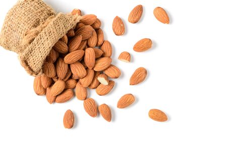 almonds nuts with sack isolated on white background and top view, Almonds are very popular nuts and high protein . healthy food.