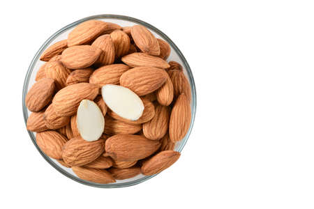 Top view of Almonds nut on glass cup isolated on white background. They are highly nutritious and rich in healthy fats or High-density lipoprotein (HDL) cholesterol, antioxidants, vitamins and minerals.
