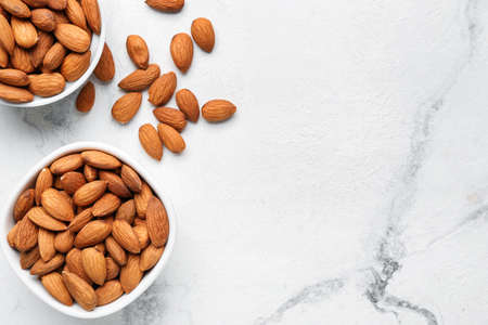 Healthy food for background image close up almond nuts. Texture on white grey table top view. Nuts on the cup plate