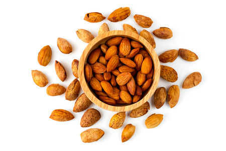 Close up of almonds nut seeds isolated in wooden bowl against top view on white background and clipping path.