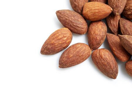 Almonds on white background top view on the table, Close up roasted almond nuts natural protein food and for snack