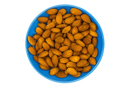 Almond nuts in a bowl on white background. Top view.