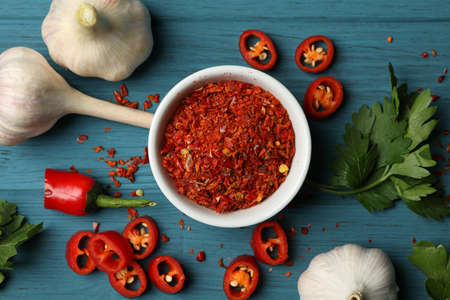 Very Hot Chili Peppers on Blue Paper Background Top View with Space for Text. Red Spicy Chilli Peppers Pattern or Backdrop for the Indian Menu for Oriental Food Design