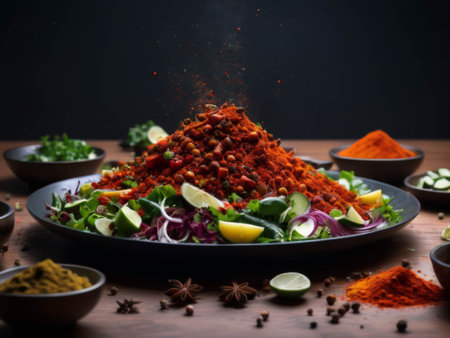 Mixed salad with chilli on rustic table. Fresh diet salad served in plate. Mixed salad served on plate on rustic background. Fresh salad diet. Salad on plate. Vegan salad on plate. Vegan and ve