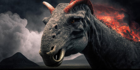 AI Generated. Fossilized beast skeleton model with open mouth on display