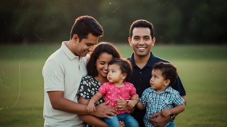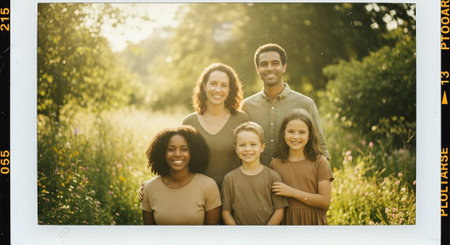 A happy, cheerful family bonding outdoors, looking at camera generated by artificial intelligence