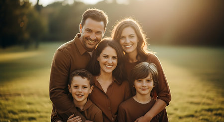 A large, happy multi-generational family poses together on the grass in a park during the golden hour. Grandparents, parents, and children smile brightly, representing strong family bonds and togetherness.