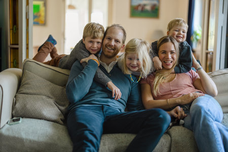 Happy family with two children sitting on sofa in living room at home