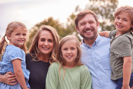 A happy family of five smiling together in a beautiful outdoor setting