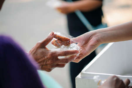Beggar begs food from donors: concept of poverty in Asian society: Care concept : From the philanthropist to help