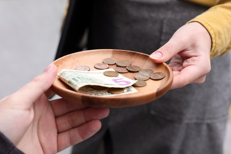Woman giving coins to poor homeless man with bowl of donations, closeup