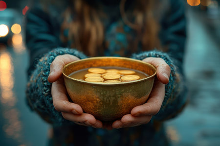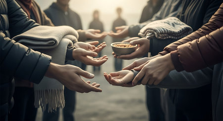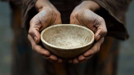 A poignant image of hands holding an empty bowl symbolizes the themes of poverty and hope. This visual evokes emotions related to kindness, support, and humanitarian outreach.