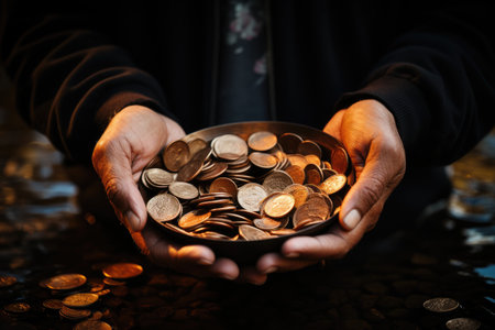 Closeup of a homeless man holding coins outdoors, evoking empathy and highlighting the harsh realities of poverty and social inequality. Ideal for charity campaigns and social advocacy.