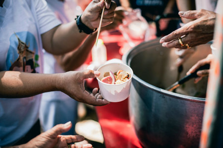 The concept of sharing help : Participation in sharing food for the poor : The Concept of Love : The beggar is waiting for food from charity aid
