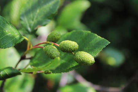 A detailed photograph of a single Serviceberry, swaying gently in the wind, captured in natural daylight. Fresh and airy atmosphere, soft motion blur on leaves, crisp details on textures, background softly blurred into natural greenery, cinematic natural light, realistic photography style.
