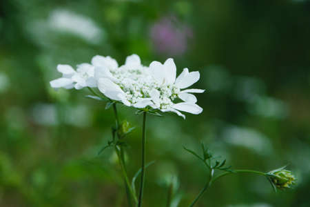 One lilac field flower Scabiosa Pincushion Flower in female hand with green grass radial blur background. Wildflowers texture. Close up of Scabiosa Butterfly Blue called Pincushion flower or Scabious