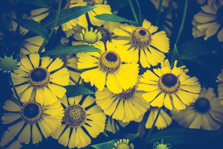 Bunch of bright yellow flowers, daisy in the summer garden.