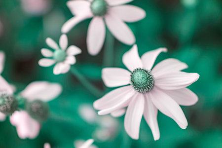 Infrared photography, a close-up view of pinkish-white flowers with green centers