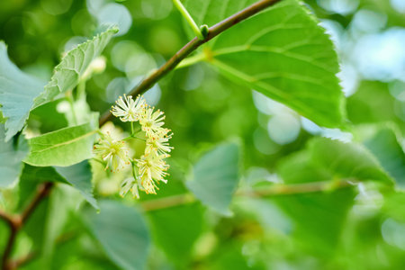 Floristics, botany concept - delicate little white flowers from lower macro angle against background of sunset with soft focus copy space. Closeup of Stellaria holostea L. family Caryophyllaceae.
