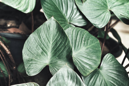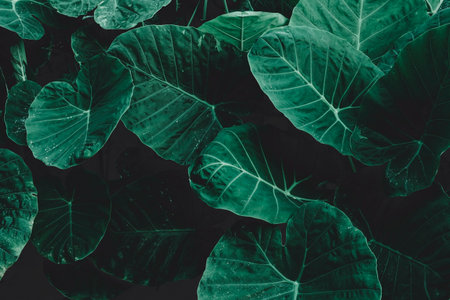 Large foliage of tropical leaf with dark green texture, abstract nature background.