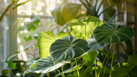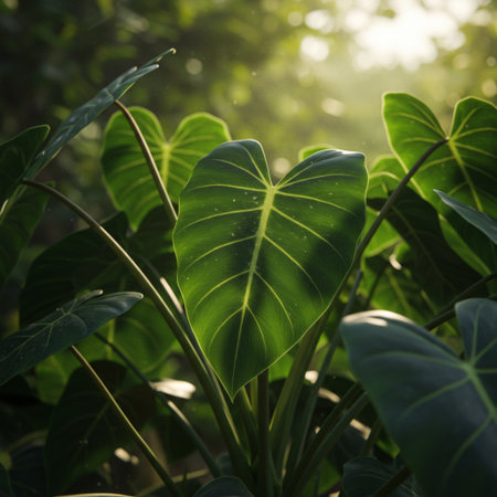 Close-up of vibrant green tropical leaves bathed in soft natural sunlight, conveying a peaceful and refreshing natural atmosphere. Suitable for themes of nature, botany, and relaxation.
