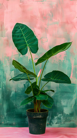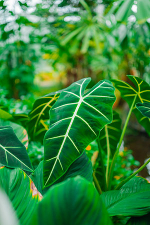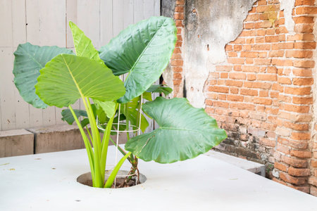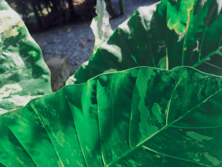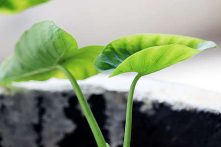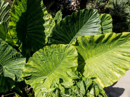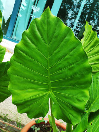 The leaves of the taro plant are wide and fresh green, used as home garden decorations