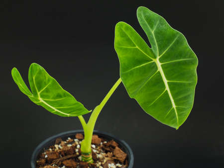 Alocasia polly foliage. Alocasia in pot on green color background. small green plant. Botanical name is Alocasia Polly
