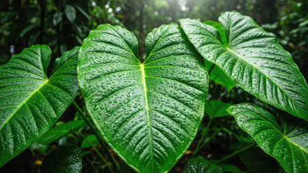 Large, vibrant green elephant ear leaves covered in water droplets, bathed in sunlight within a lush, sunlit tropical rainforest.
