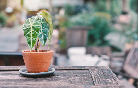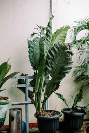 Closeup Alocasia Amazonica Sanderiana in white plastic pots