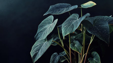 Dark, atmospheric backdrop with water droplets on deep green leaves, showcasing the natural beauty and details of the plant in a moody setting.