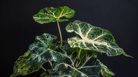 Close-up of vibrant Alocasia leaves with white variegation, highlighted against a dark background, representing nature's beauty and houseplants.