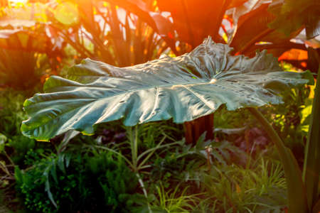 Leaves of a tropical plant Alocasia macrorrhiza (Giant Taro) in the rays at sunset. The leaves of the Elephant Ear plant is bred for decorative, food and medicinal purposes in Asia, Oceania, South America