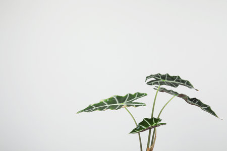 Green plant Alocasia Polly on white background. home plant concept. Texture of flower leaves. tropical plants