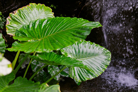 Glossy green elephant ear leaves dominate foreground, their waxy surfaces catching light. Behind them, a gentle waterfall cascades over rocks, adding motion and serenity to lush tropical setting