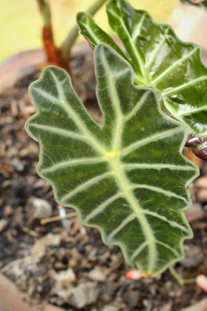 Beautiful dark green and velvety leaves of Alocasia Frydek