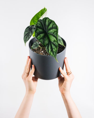 A vertical shot of a female holding an Alocasia cuprea potted plant near a white wall